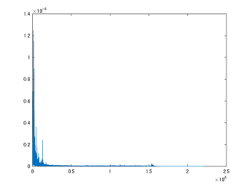 Fs = 44100; y = audioread('IMG_0574.MOV'); sound(y, Fs); L = length(y); figure(1); plot((0:L-1)/Fs, y(:,1)); Y = fft(y); P2 = abs(Y/L); P1 = P2(1:int32(L/2)); P1(2:end-1) = 2*P1(2:end-1); f = Fs*(0:(L/2))/L; figure(2); plot(f,P1);